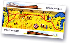 In their distinctive color and decorative treatment the new EMPIRE BUILDERS give delightful expression to the vast and diverse Northwest Empire which Great Northern has served and helped develop for more than 60 years. Inspiration for the decor of the trains came from the striking color and beauty of this superbly scenic territory, from its traditions, resources and enterprise. Elaborate planning and research are reflected even in minor details, as will be noted in the descriptions of the individual cars.