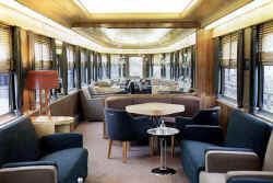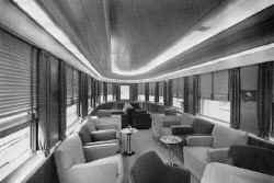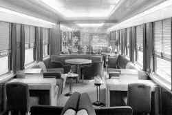 Deep cushioned settees and lounge chairs in this luxurious car provide seating for 24 persons, with table accommodations for an additional 12. Soft drinks and spirituous liquors are available, subject to regulations applicable to the state through which the train is running at the time.